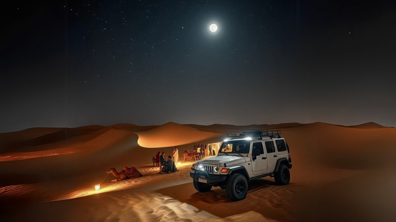 Feel the excitement as you ride a 4×4 through shimmering sand under a glowing night sky.​